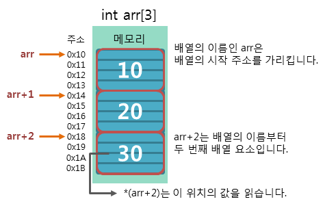 - 인덱스를 사용하는 대신 배열의 시작 주소로 포인터 연산을 하면 배열의 특정 원소에 접근가능