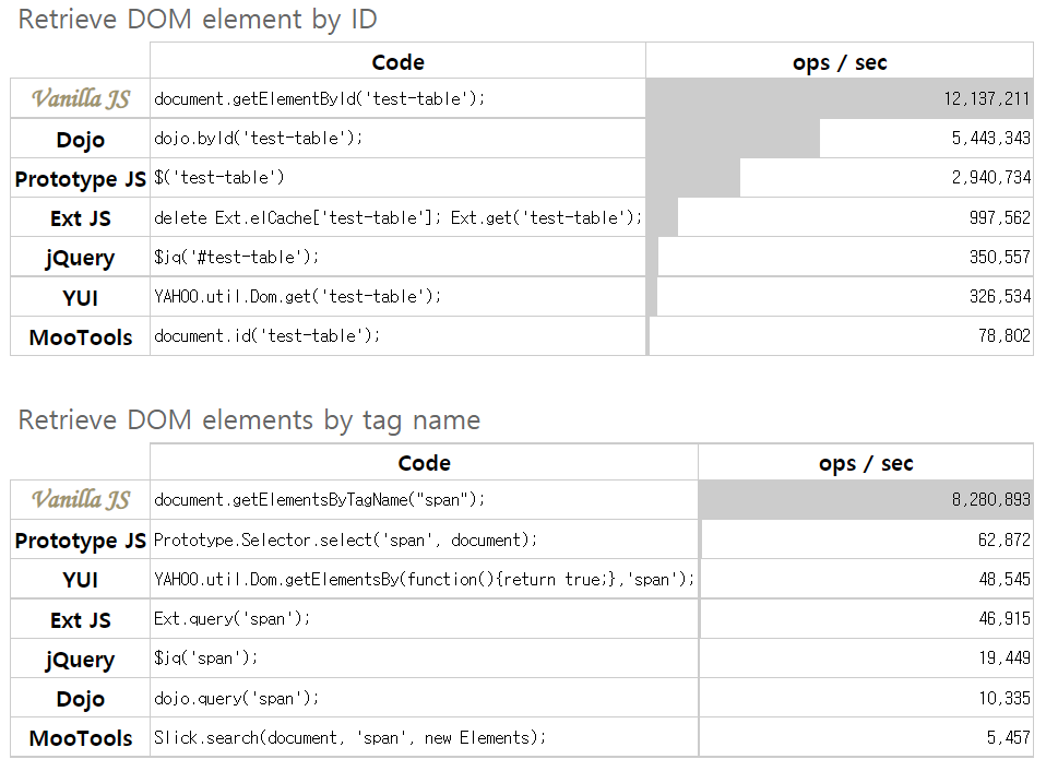 VanillaJS 코드를 다르게 해석한 모습이다. 위에서 보듯이 JavaScript가 다른 것들에 비해 엄청 빠른것을 알수있다.. 120만개가 넘는 작업을 1초만에에 수행할 수 있다.